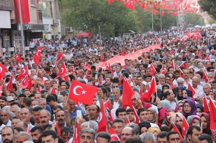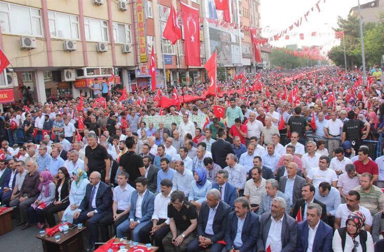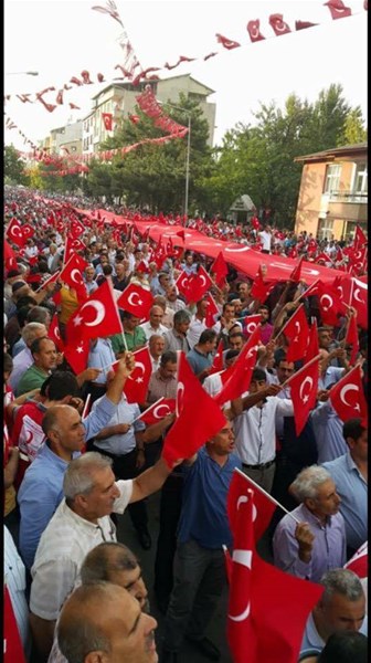 Valilik önünde toplanan ve ellerinde Türk bayraklarıyla Genç caddesinden yürüyerek mitingin yapıldığı 15 Temmuz Direniş Meydanı'na gelen sivil toplum kuruluşları üyeleri ve vatandaşlar terörü lanetledi.